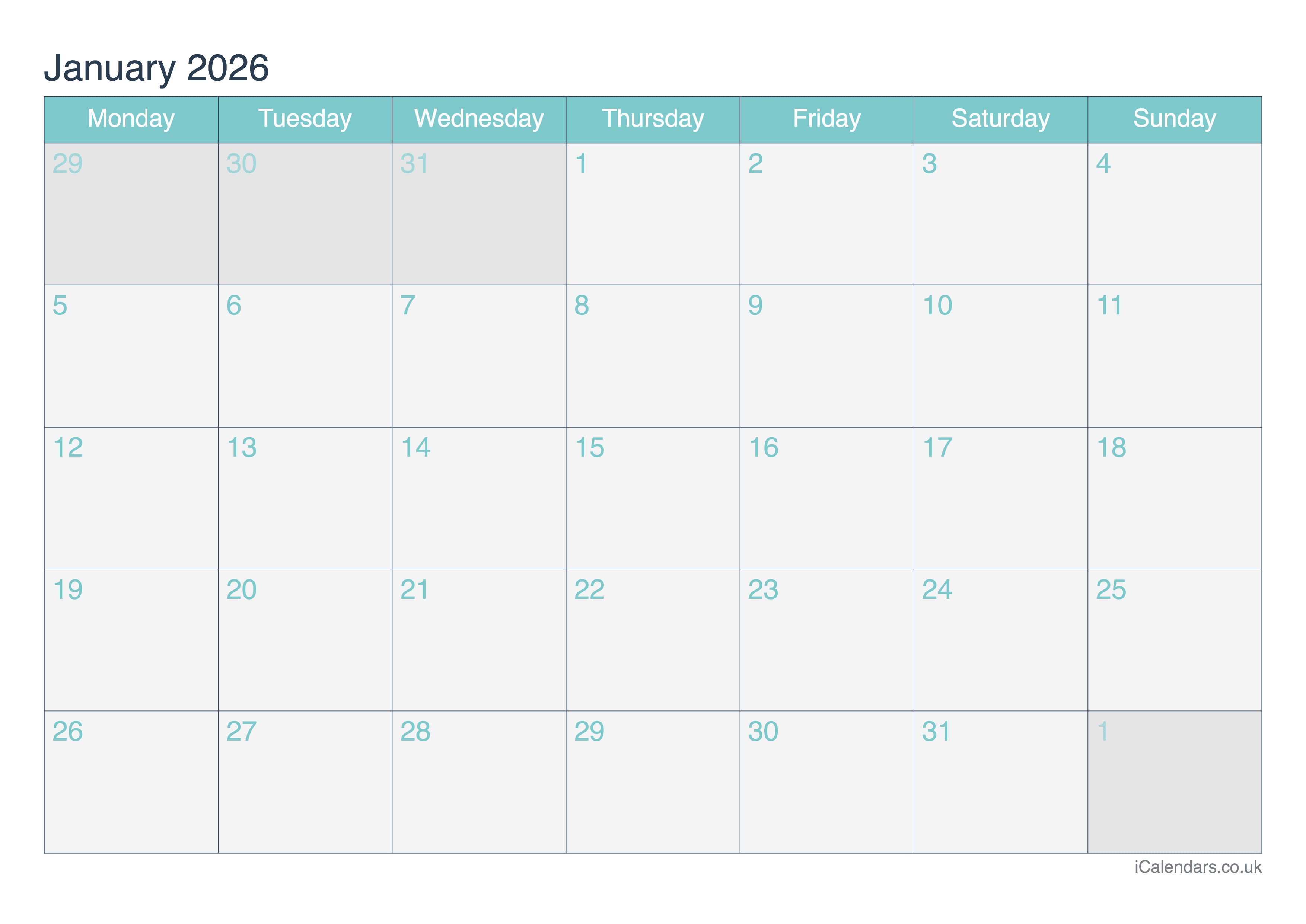 You can download and print this January 2026 calendar. It is available as an image, or in PDF and Excel formats. You can choose one of the 4 colour themes.