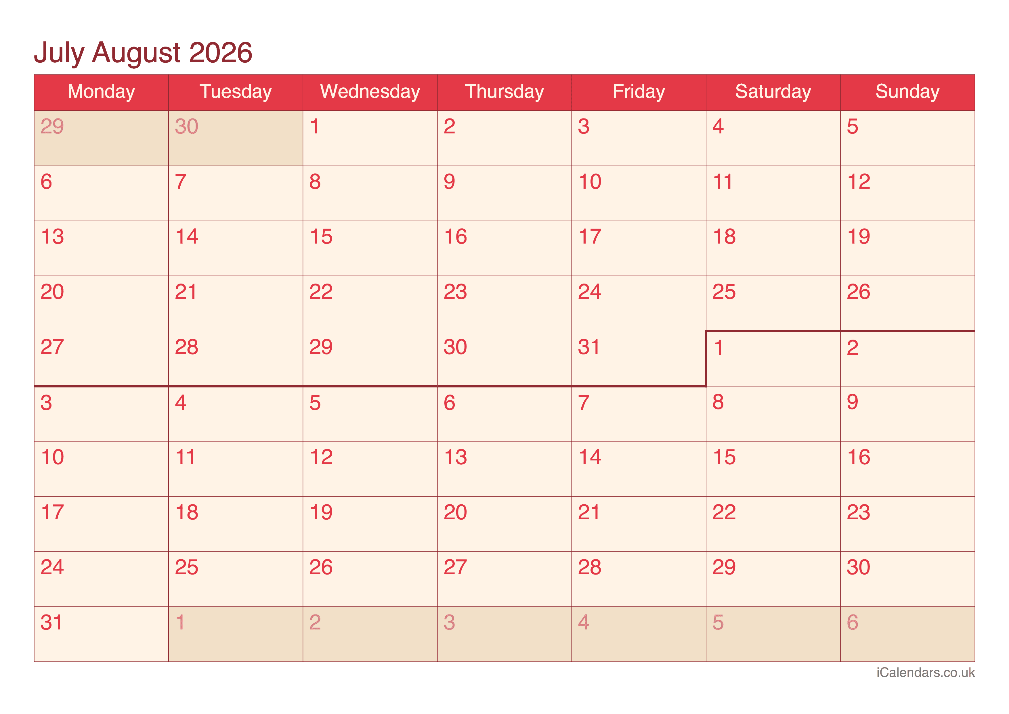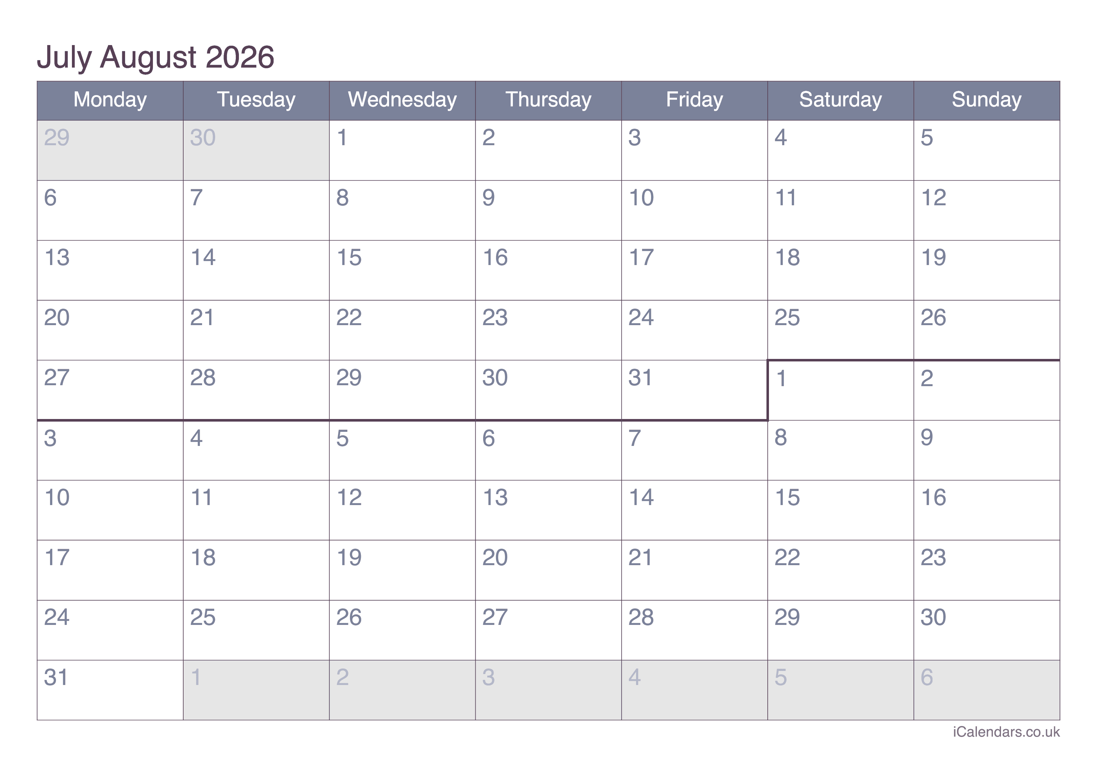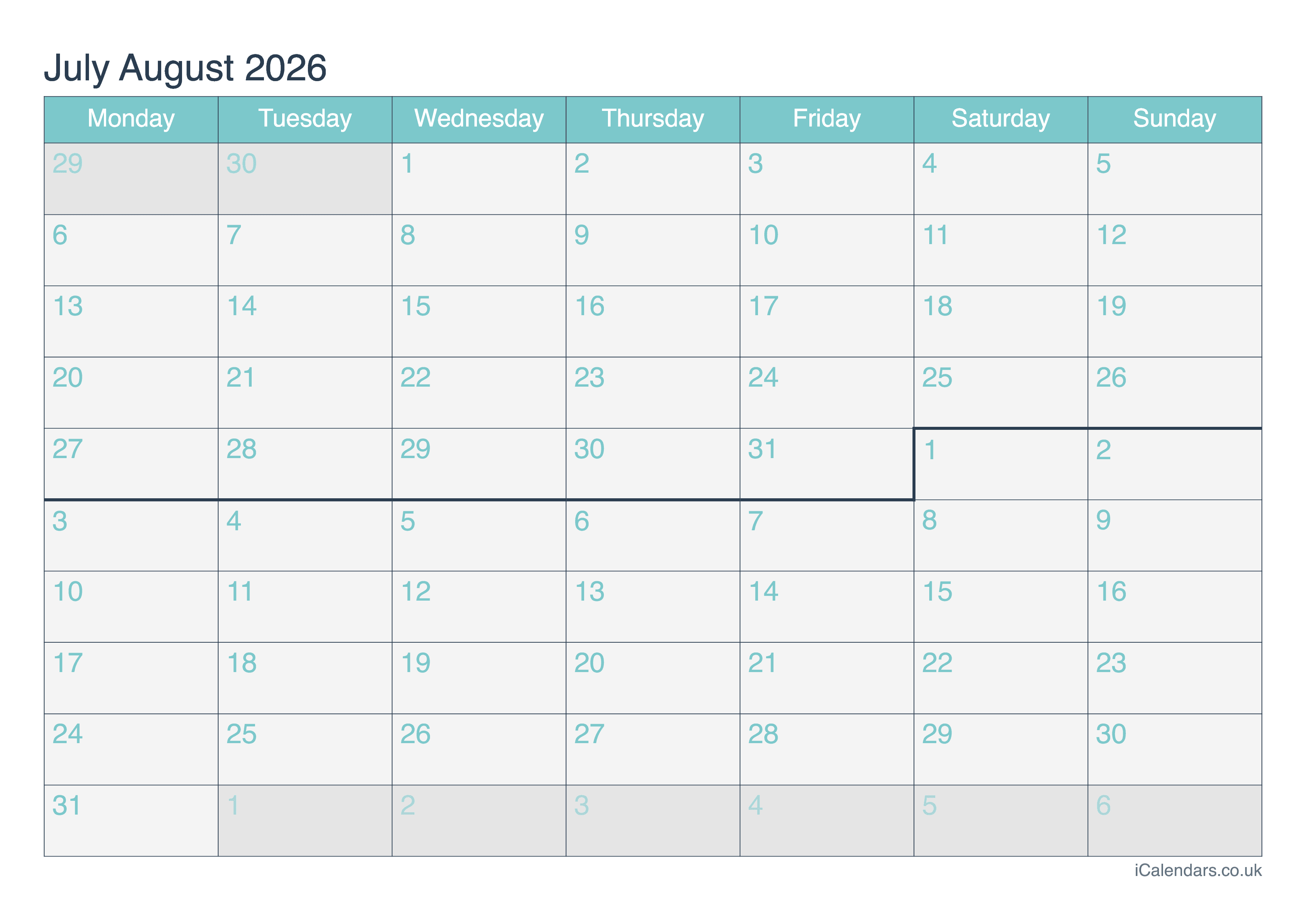 You can download and print this July-August 2024 calendar. It is available as an image, or in PDF and Excel formats. You can choose one of the 4 colour themes.