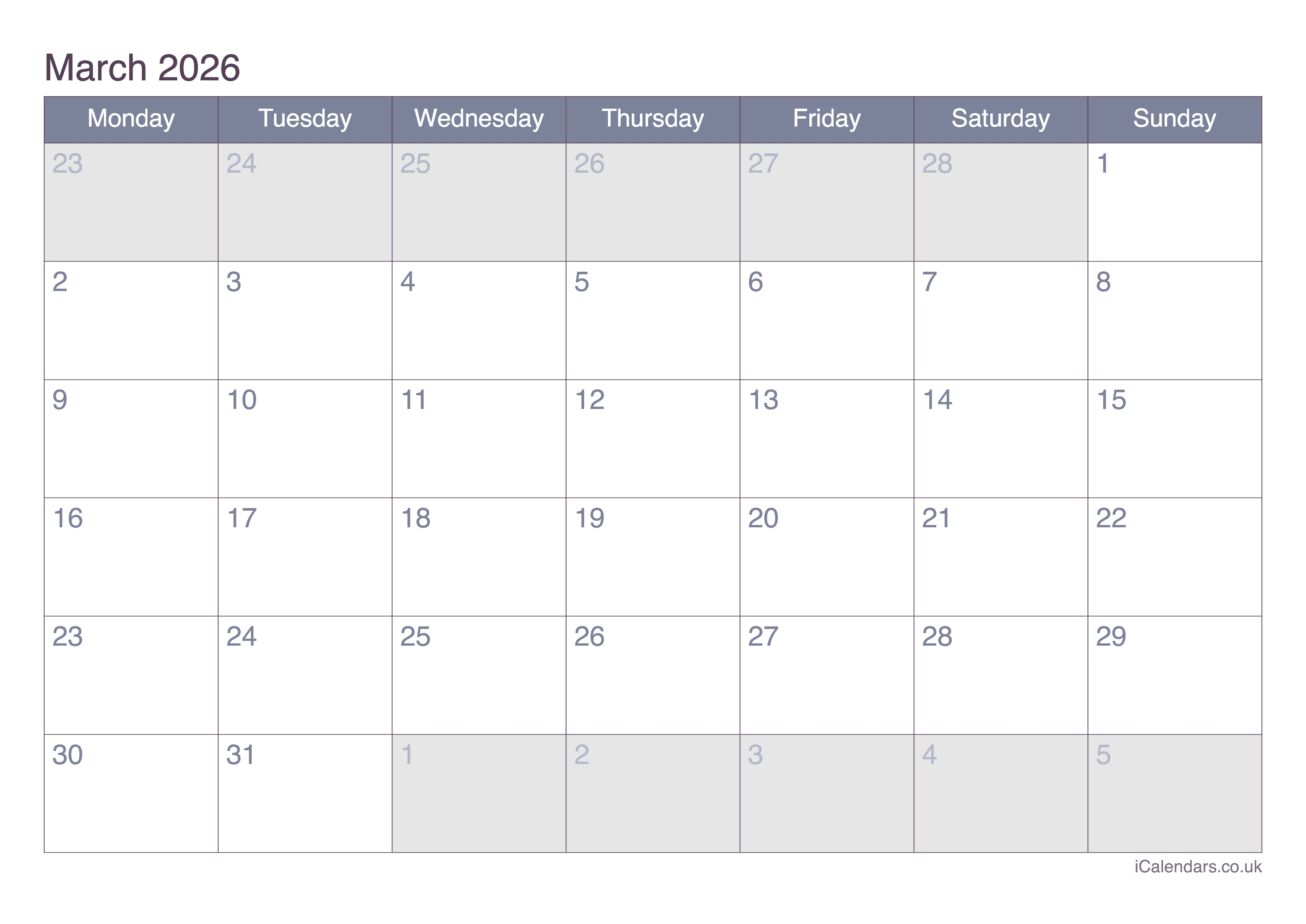 March 2026 Printable Calendar